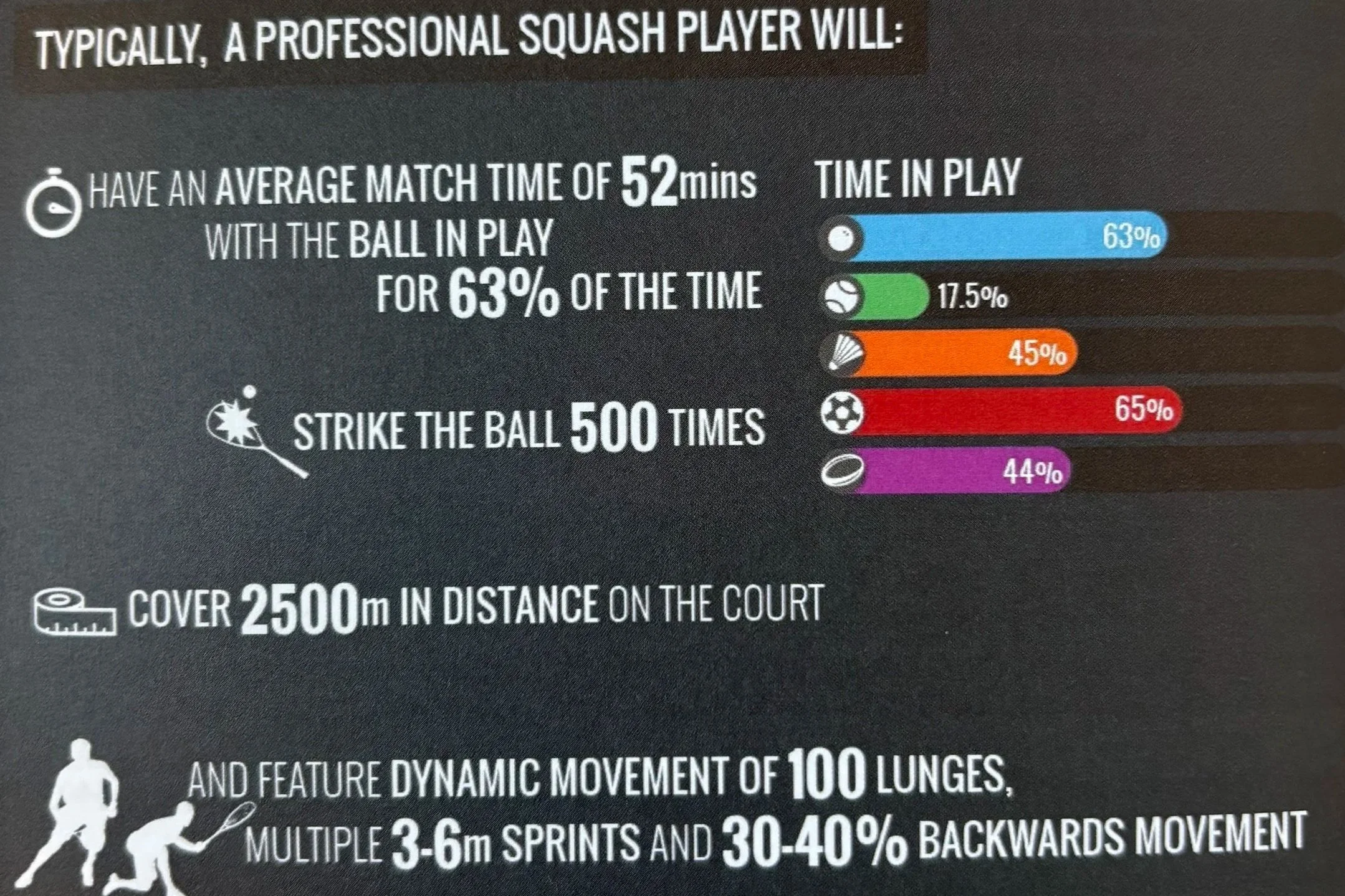 In fact, at the professional level, a squash match on average lasts an average of 52 minutes, the ball will be struck up to 500 times by each player, they will travel 2.5 kilometres (!!) and produce up to 100 lunges. Yep, sounds like a pretty intense circuits class to me.